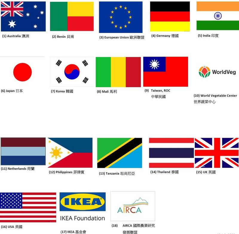 的旗幟分別屬於亞蔬的長期資助國家、亞蔬區域中心所在地及合作夥伴,IKEA是亞蔬的重