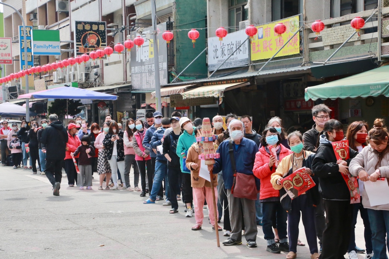 許多參拜的民眾紛紛排隊領取台南市長黃偉哲的龍年紅包,