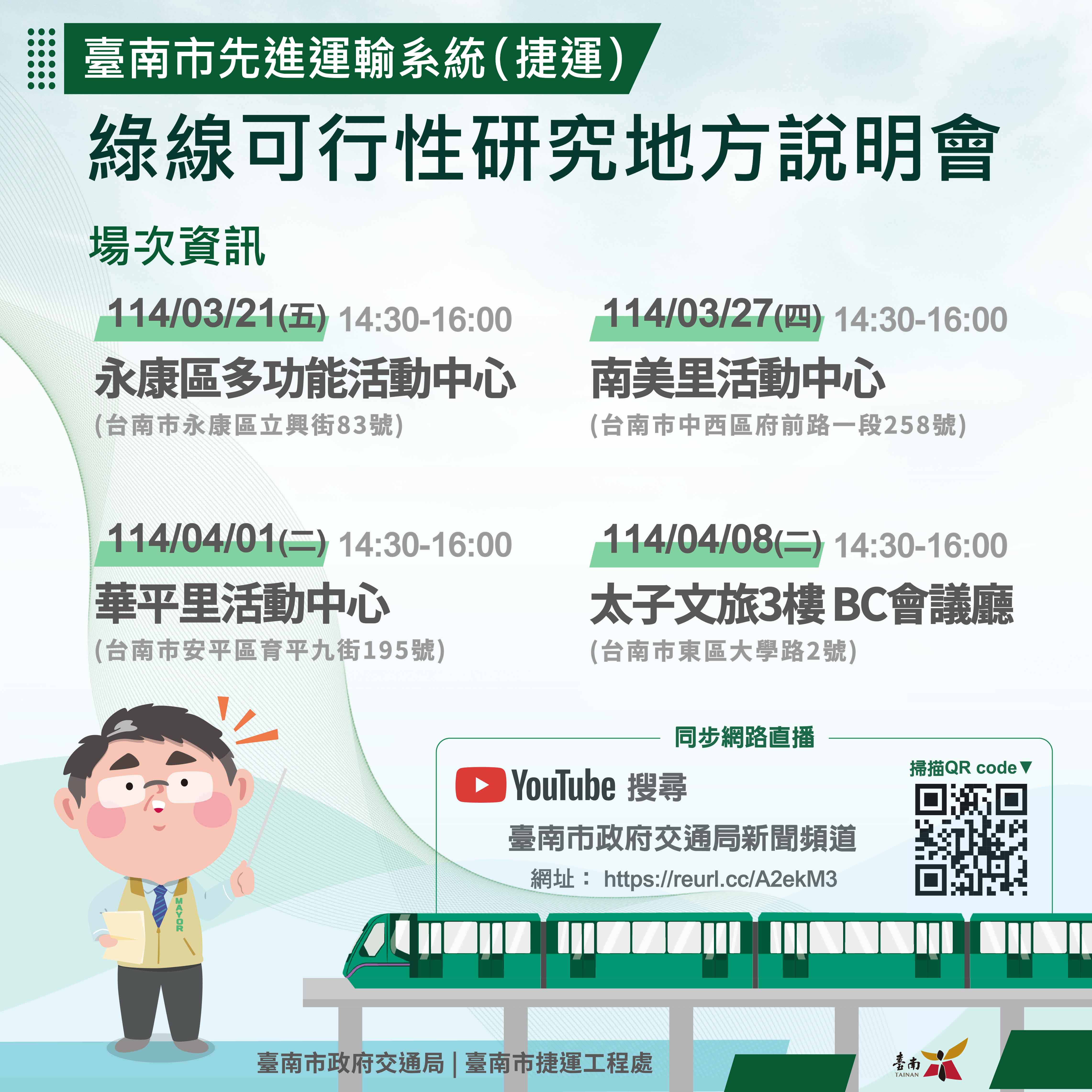 交通局提醒,各說明會場次資訊可至捷運工程處官方網站及Facebook「運轉台南好交通」
