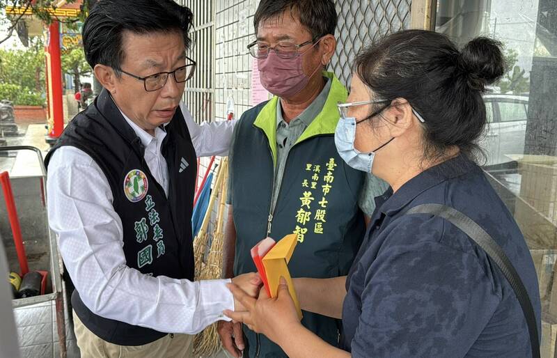 台南七股溪南里吳姓阿嬤因停電點蠟燭被燒死,立委郭國文(左)慰問家屬。(郭國文提
