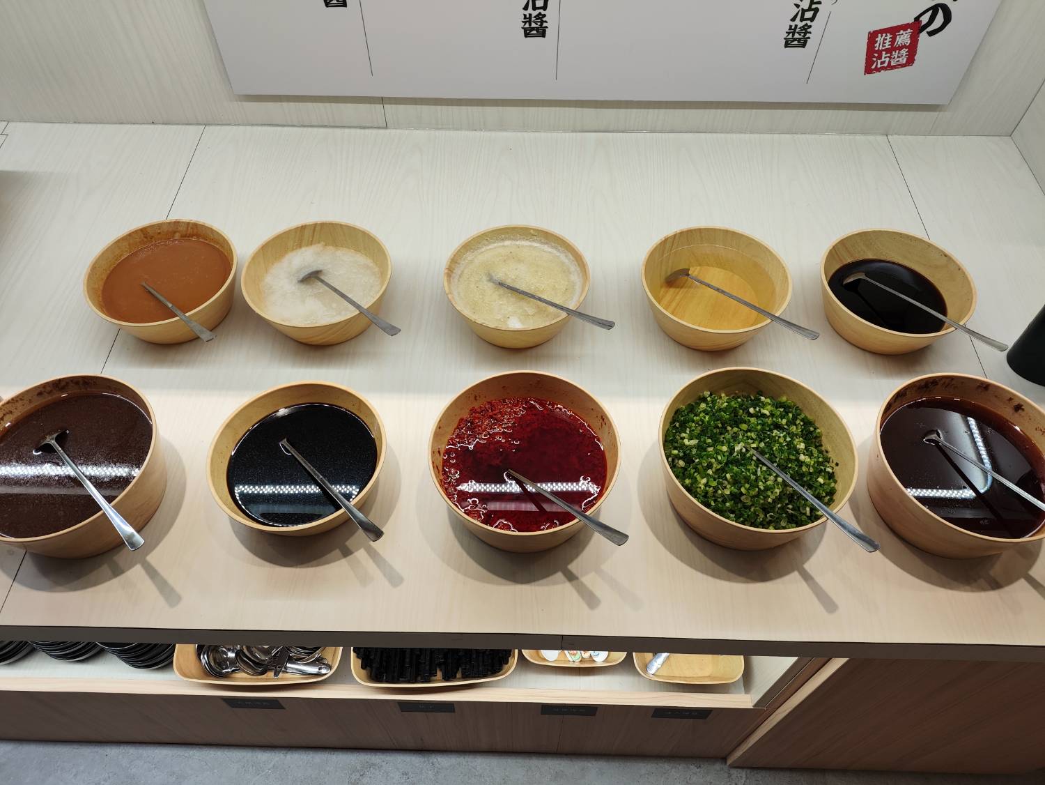 沾醬,左下是葷的沙茶醬,右下是素食沙茶醬,所以素食者也沒問題