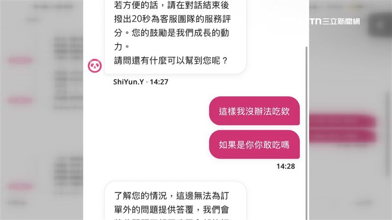 你,你敢吃嗎」,得到的回覆是「這邊無法為訂單外的問題提供答覆」罐頭簡訊。