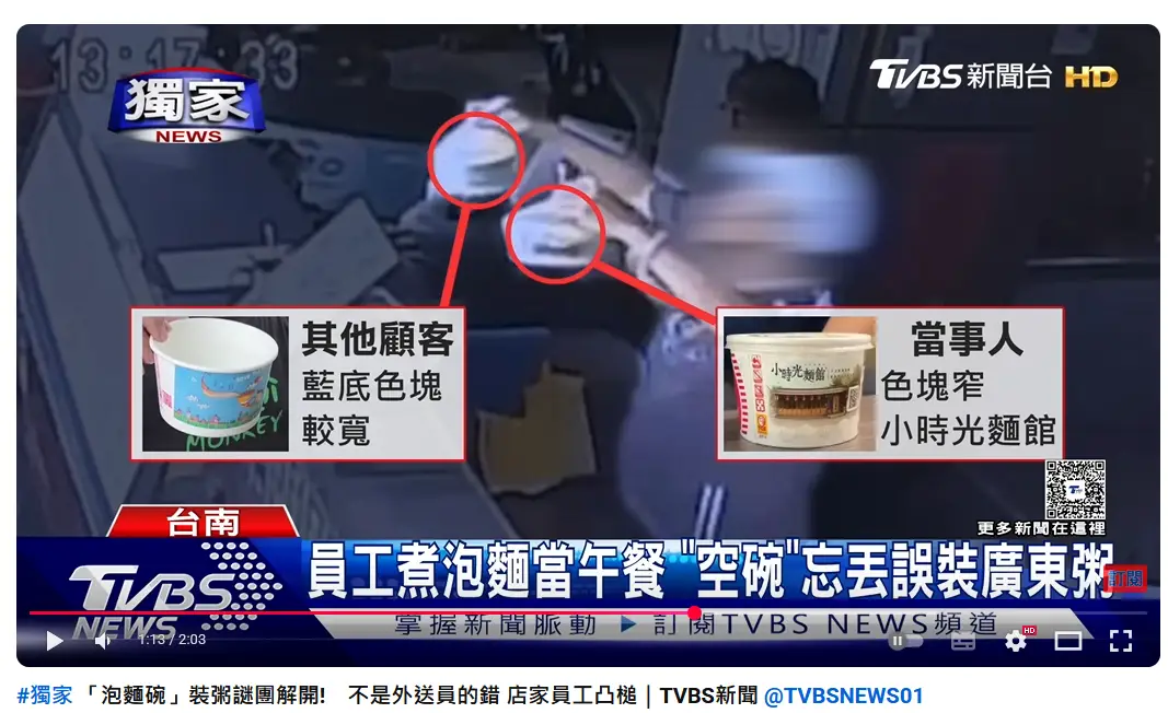 1小時發生什麼事,誰把店家的碗換成泡麵碗,等待釐清。
