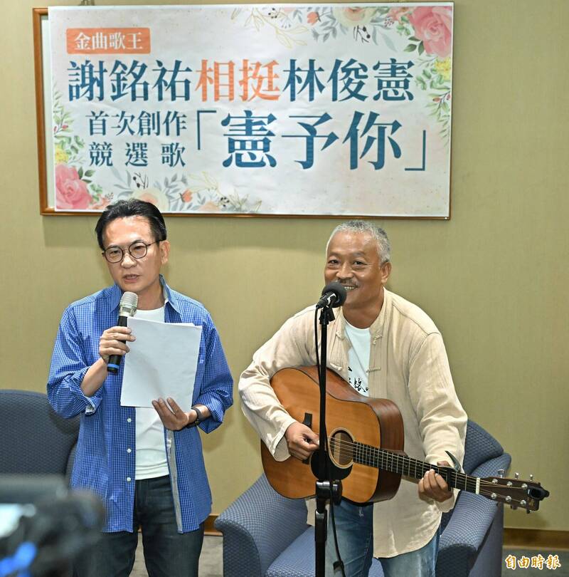 歌手謝銘祐(右)相挺民進黨立委林俊憲(左),首次創作競選歌曲「憲予你」,他今在