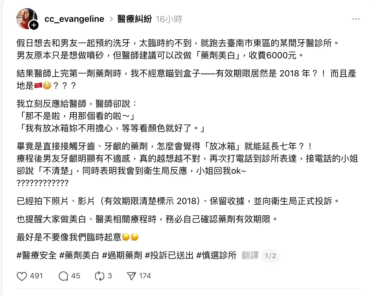 也提醒大家做美白、醫美相關療程時,務必自己確認藥劑有效期限。