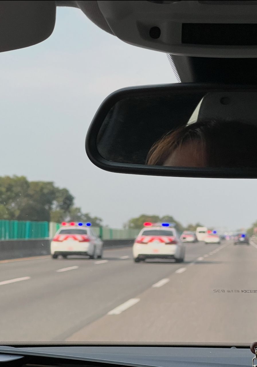 警車大概有10輛,還有好幾輛的賓士車插著國旗警察護送