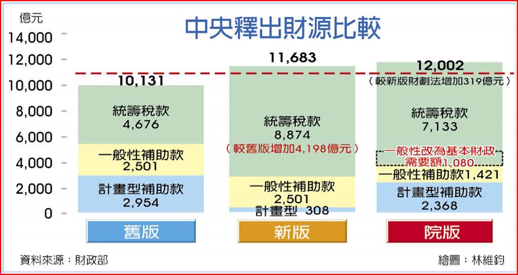 院版《財劃法》架構設算,中央釋出地方財源約12,002億元,較新版11,683億元、舊版《