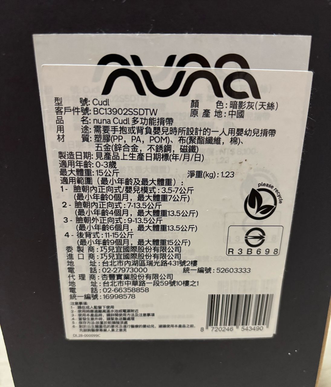 交易物品:Nuna Cudl 揹帶 暗影灰(天絲)