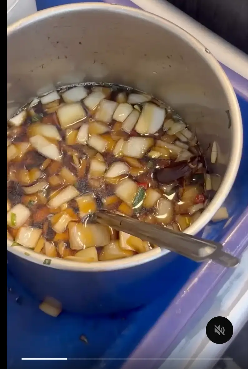 桶缸內,有一隻活蟑螂在醬汁掙扎卻爬不出來,整隻蟑螂泡在醬汁內頗令人噁心。