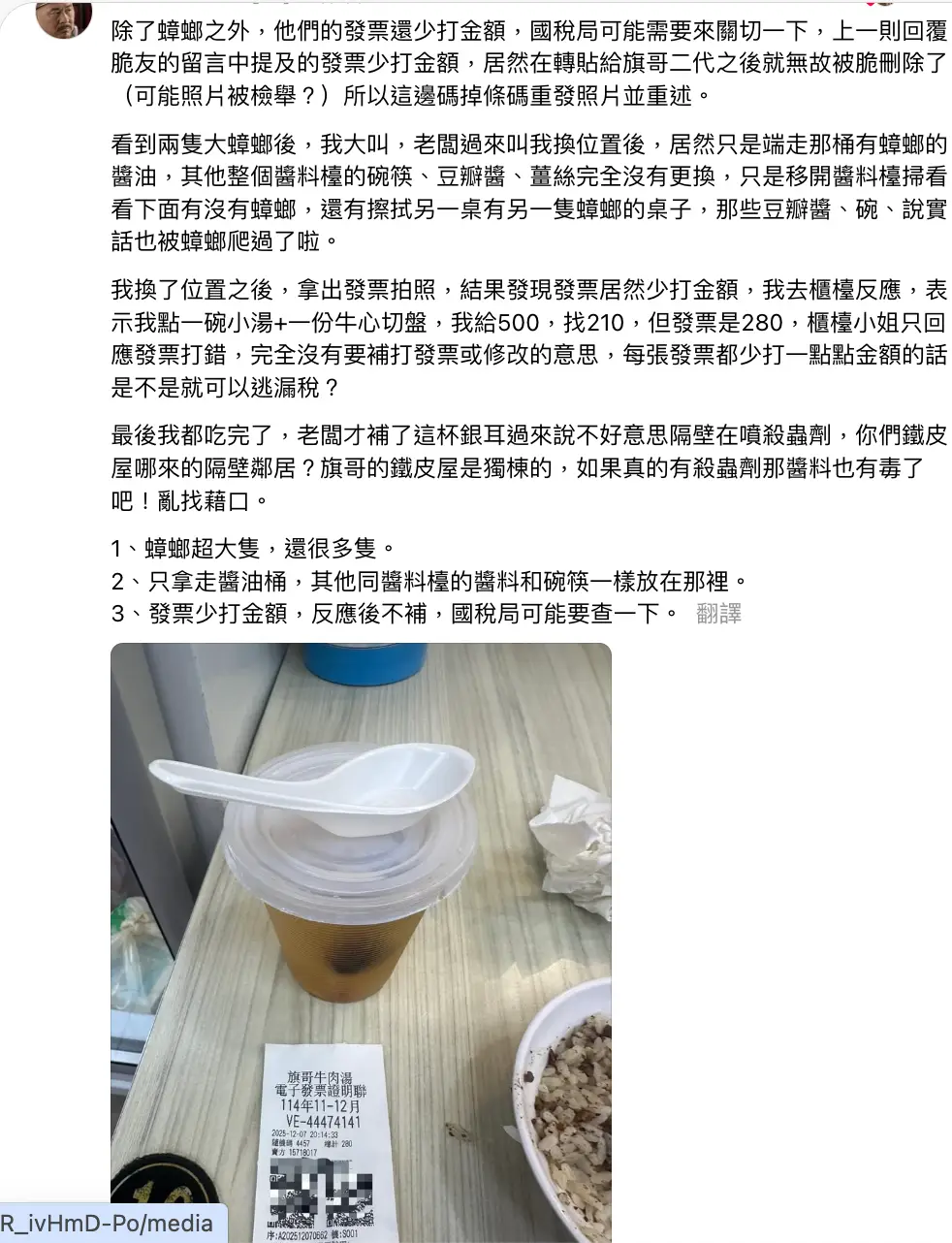 有網友在網路社群平台PO出台南知名牛肉湯店「附贈巨大活體蟑螂」,附上店內醬汁白鐵