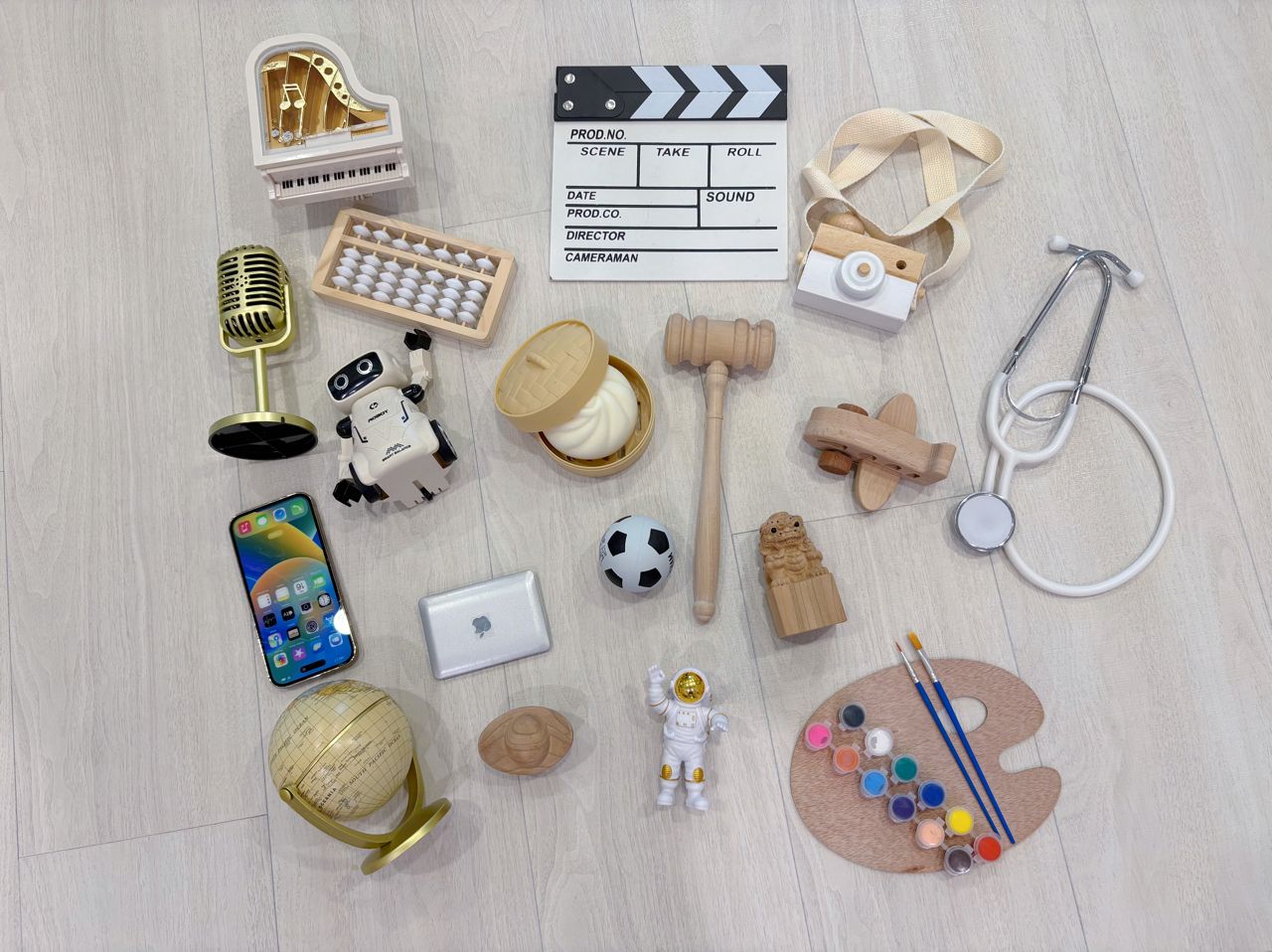 地球儀、麥克風、鋼琴、包子、電腦、太空人、官印、飛機、球、相機、元寶、法官錘、