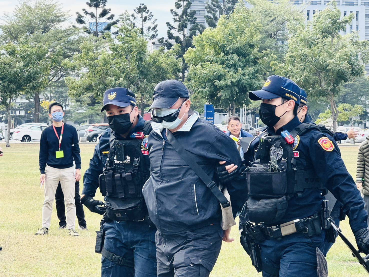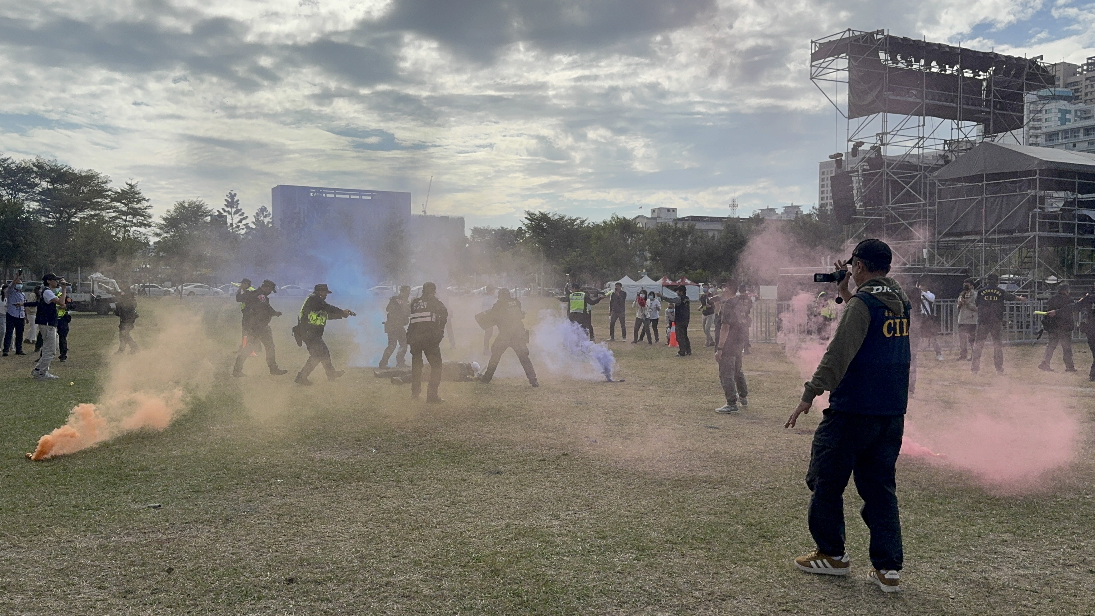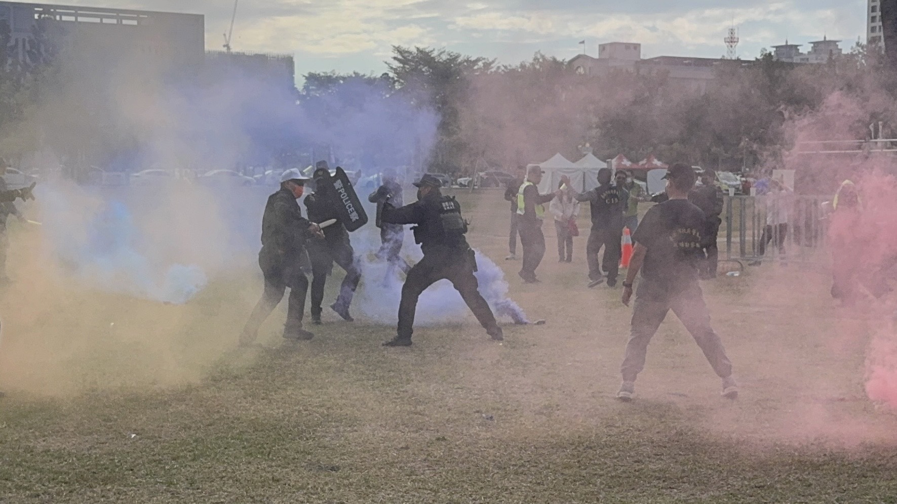 時50分在永華市政中心西側廣場舉辦維安演練,因模擬歹徒丟擲煙霧彈,現場煙霧瀰漫執