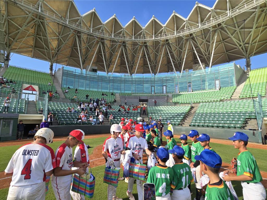 台南市少棒聯隊與美國鳳凰城市少棒友誼賽,兩隊小朋友互相交換茄芷袋及球衣等紀念品