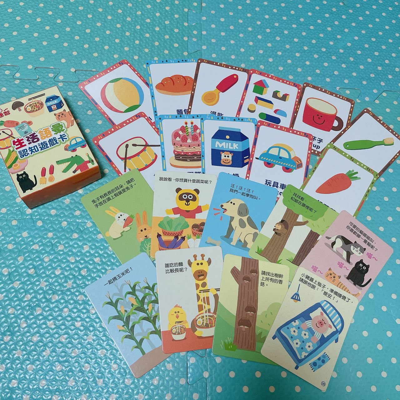 圖卡是雙面的,非常有厚度,還會出題目考考小朋友唷,盒子有稍微擠壓到,不介意再