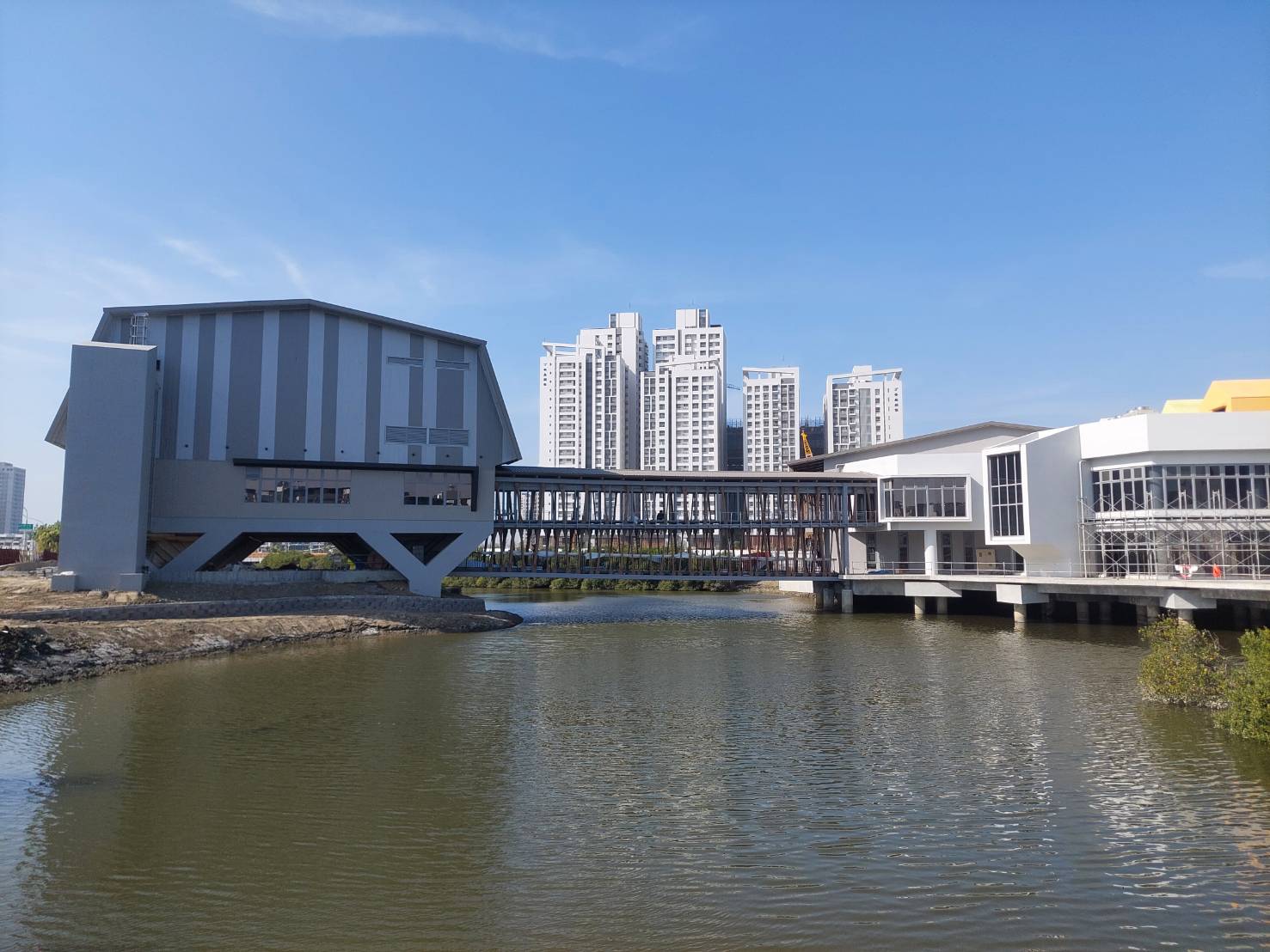 台南市安南區全民運動館,結合水岸景觀與城市環境,並採高腳屋建築形式,透過跨橋串