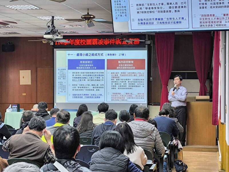 教育部校園霸凌事件調查人員培訓,桃園新莊國小校長林來利擔任主講人。(南市教育局