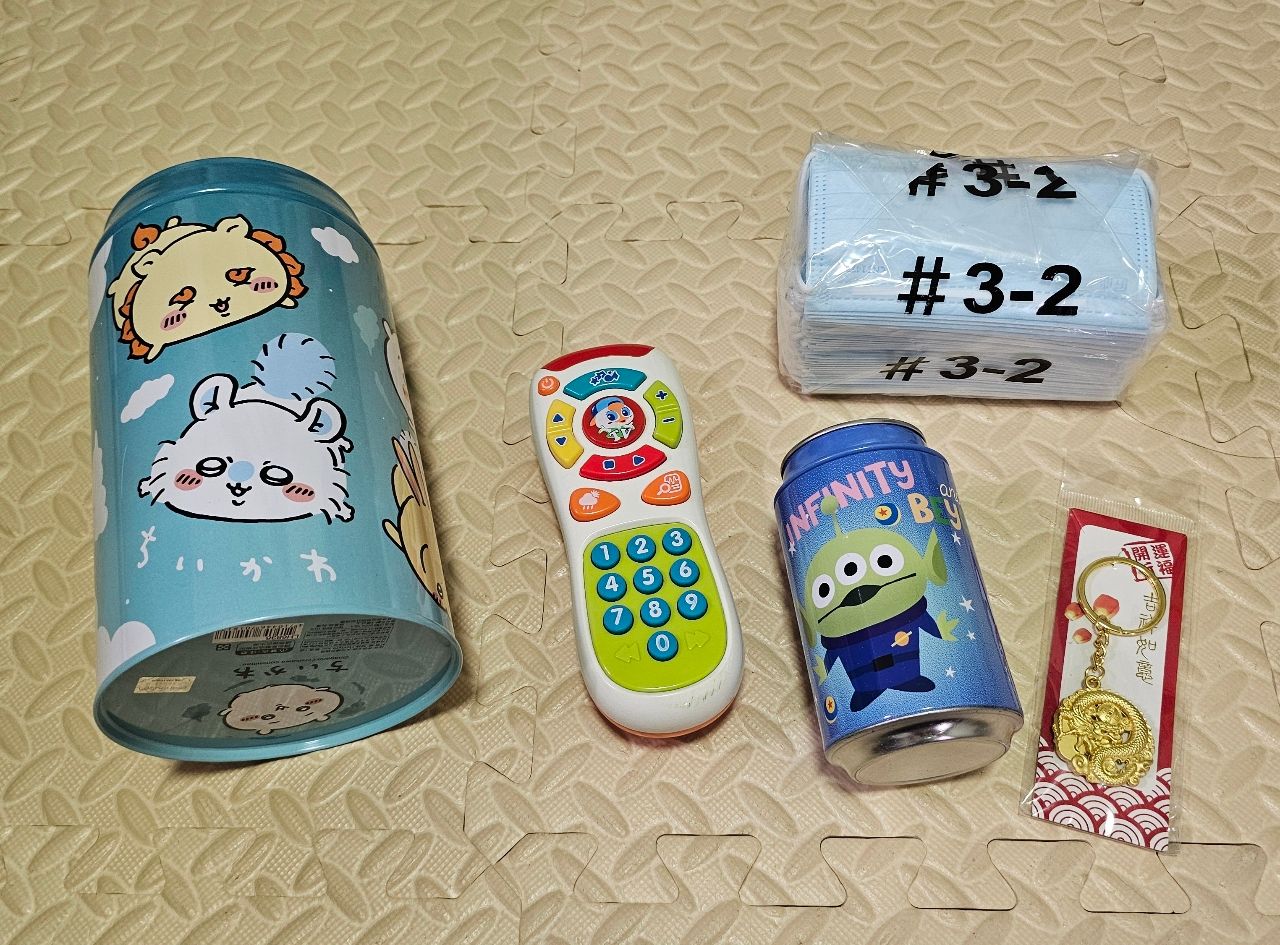 4. 存錢筒*2 + 全新兒童平面口罩 + 吊飾 + 遙控器玩具(按鍵可按,功能不確定是否正