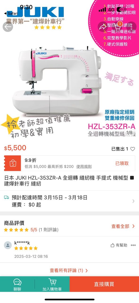 日本JUKI縫紉機,已經購入大概三年,用不到10次,家人退坑了,所以售出。