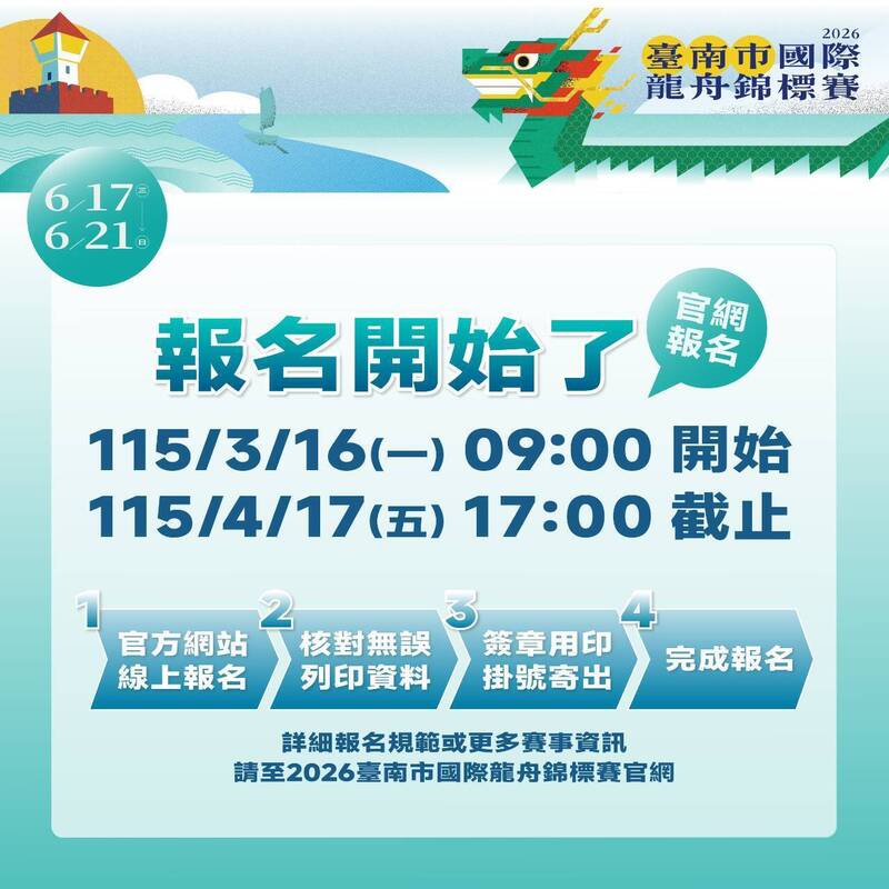 2026台南市國際龍舟錦標賽將於6月17至21日在台南運河熱鬧登場,該賽事3月16日至4月