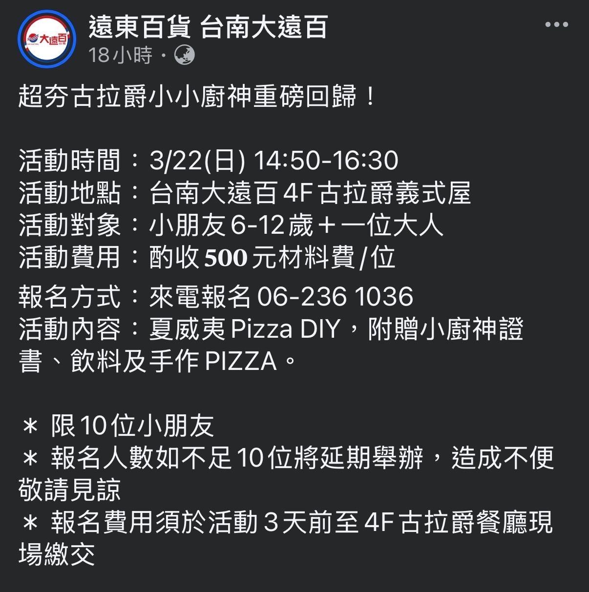 活動地點:台南大遠百4F古拉爵義式屋