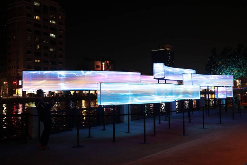 自展現不同意象。「光流百年」利用流動光軌象徵河水與時間前進的軌跡,呈現城市記憶