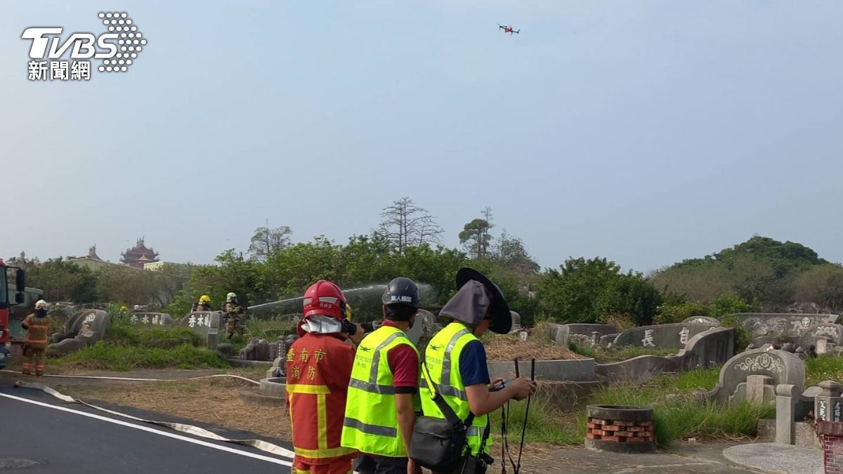 台南市消防局於3月24日在南區喜樹公墓辦理火災搶救演練。(圖/TVBS)