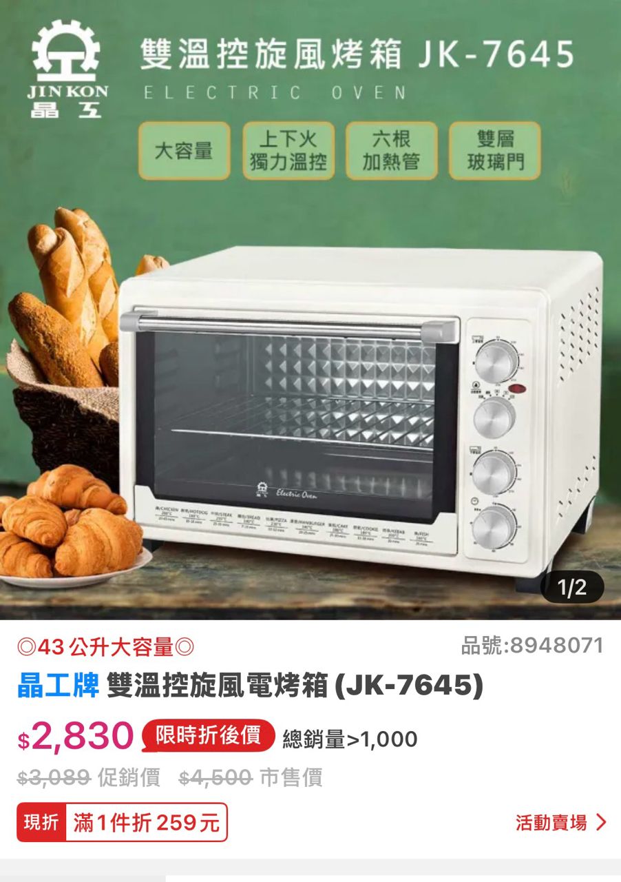 1.晶工45L炫風烤箱(JK-7645)9成新