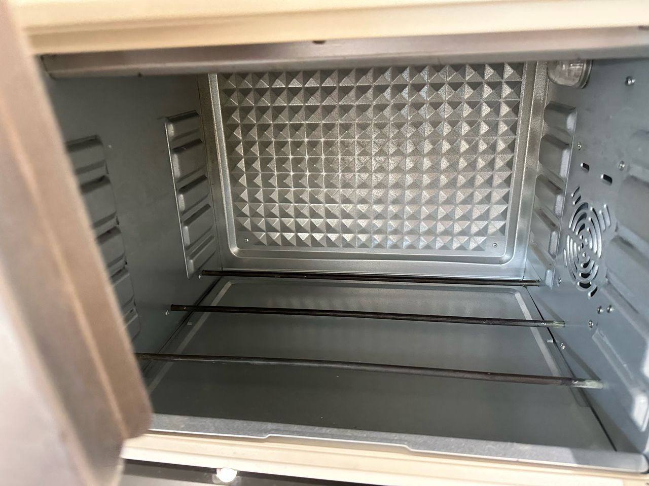 少用功能正常,烤箱內與烤盤無髒污,配件無缺,另外贈送幾乎全新深烤盤,烤箱箱子都