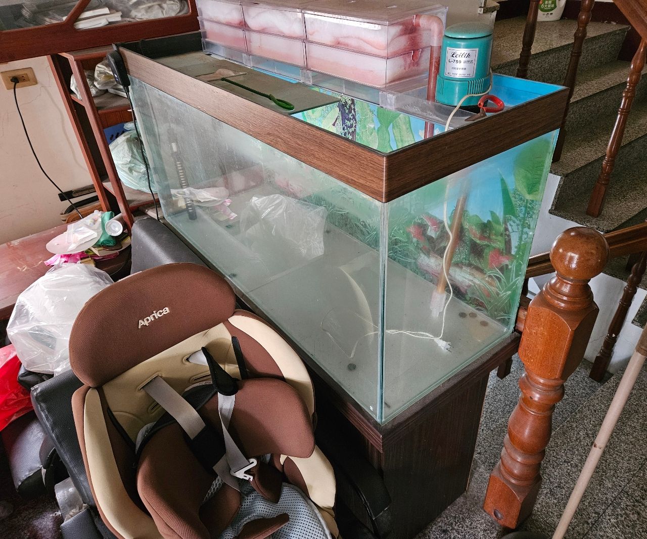 贈送玻璃水族箱、箱子上的機器、玻璃箱下面的木櫃