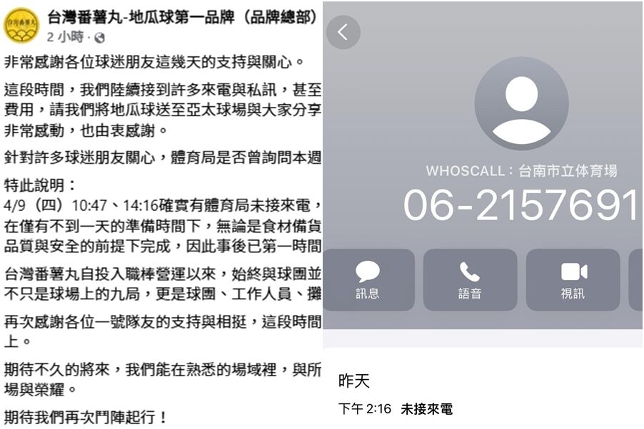 對此,原攤商之一「台灣番薯丸」也發文回應,證實4月9日上午及下午確實曾接到體育局
