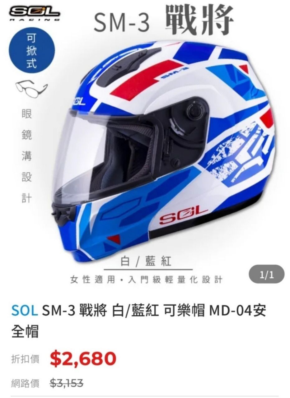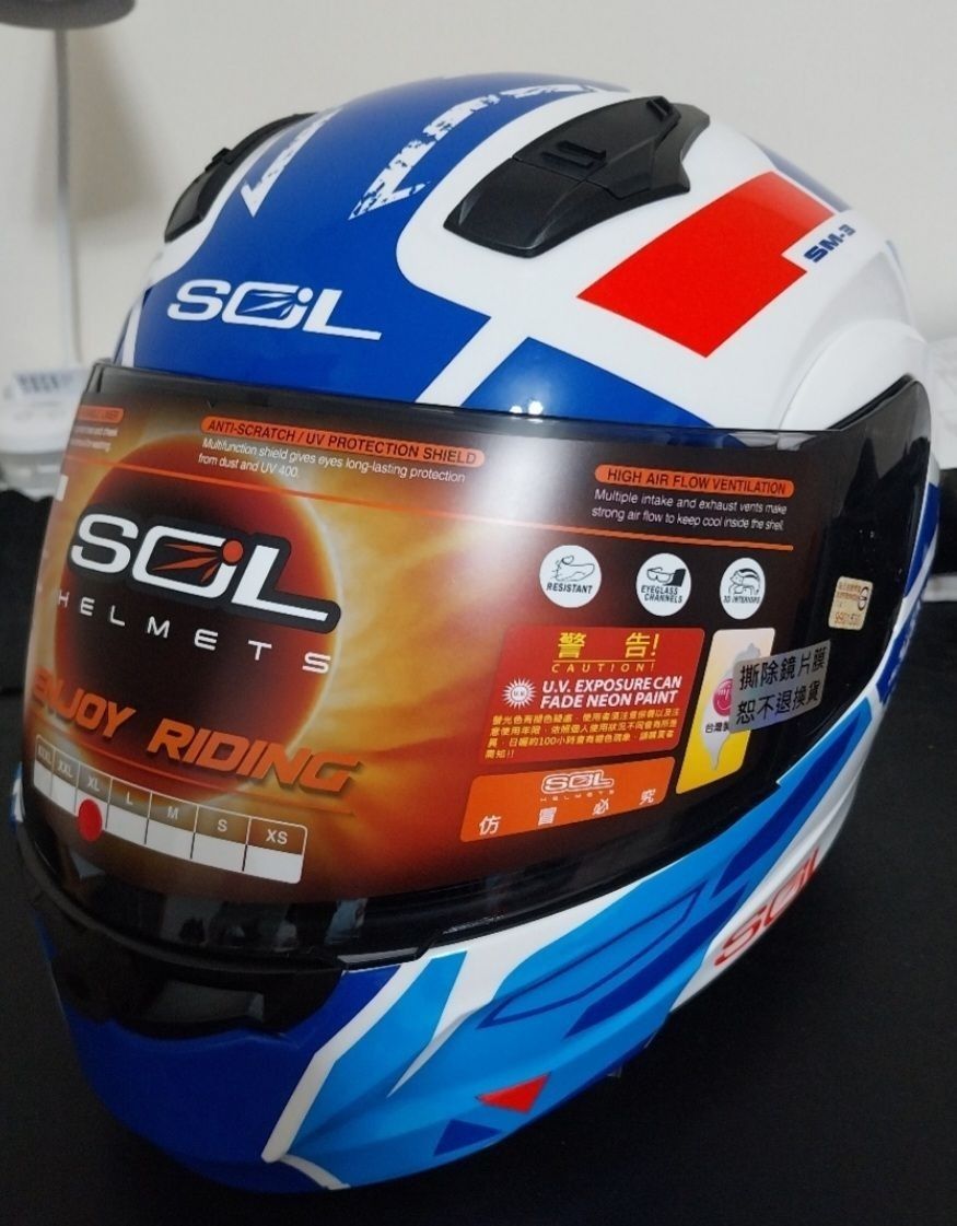 售全新SOL 【 SM-3 戰將 可掀 可樂帽 全罩式 安全帽 白/藍紅】內襯全可拆 (附上原