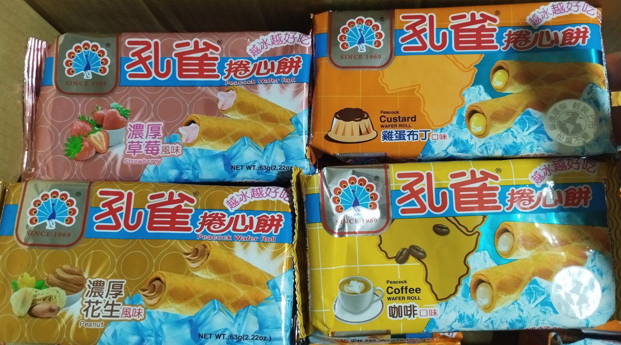 8. 孔雀捲心酥有雞蛋布丁10包,草莓10包,花生5包,1包25元,有效期限2026/8月