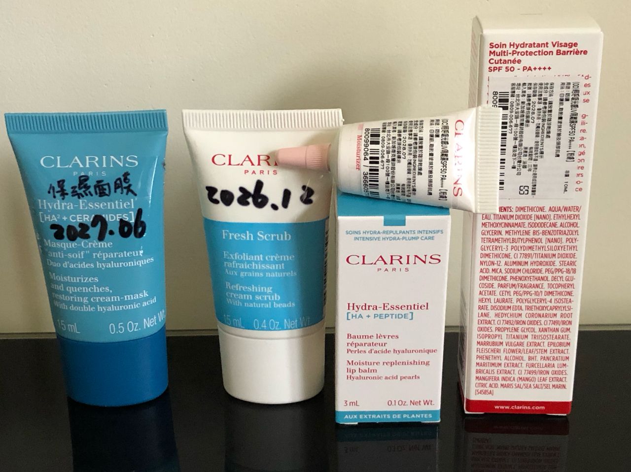 [物品]CLARINS 保濕面膜15ml+生命之葉保濕去角質霜15ml+輕呼吸光感UV隔離霜SPF++++