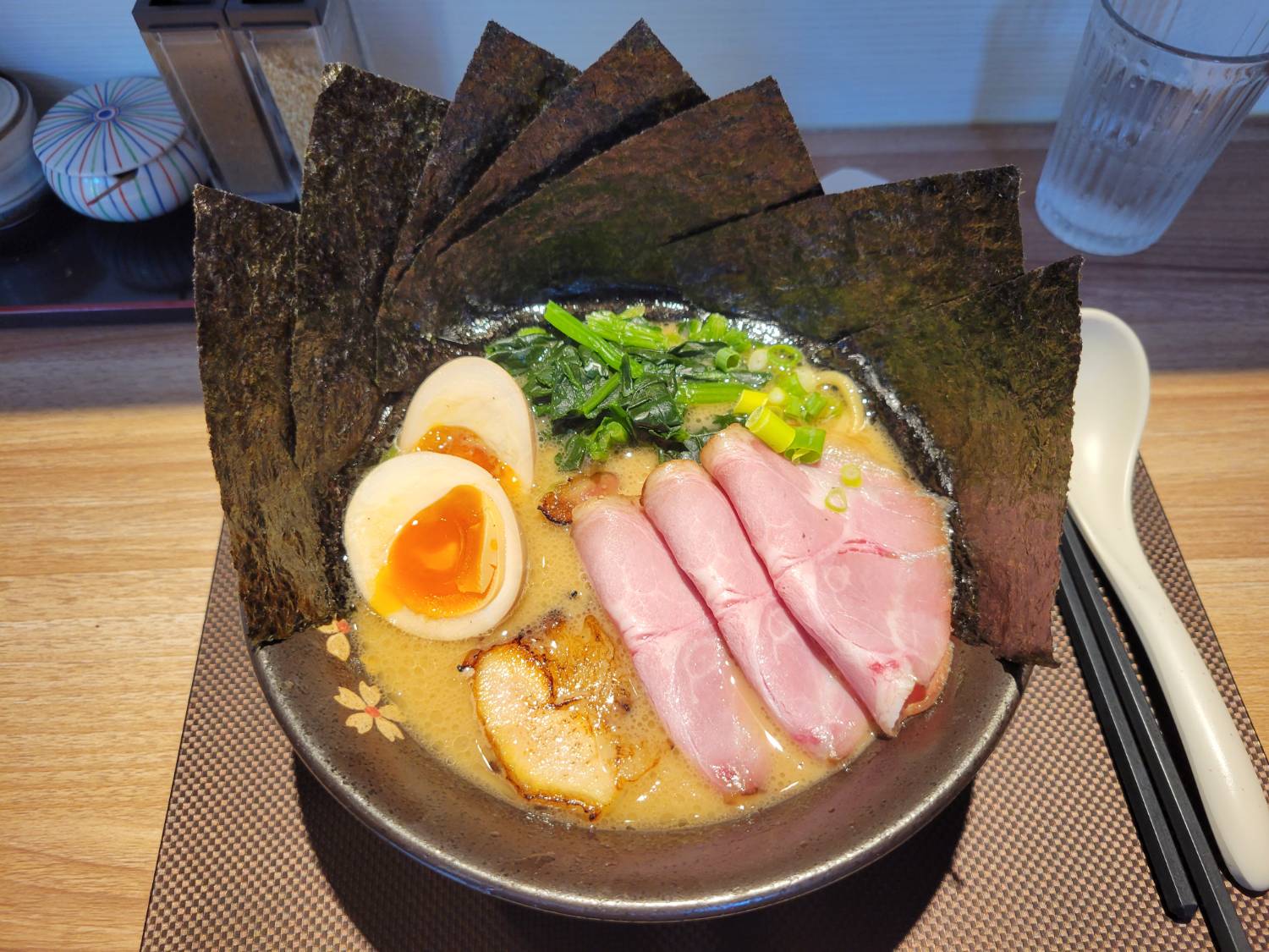 家」的拉麵風格,特色是濃郁的豚骨醬油湯頭、粗直的麵條,