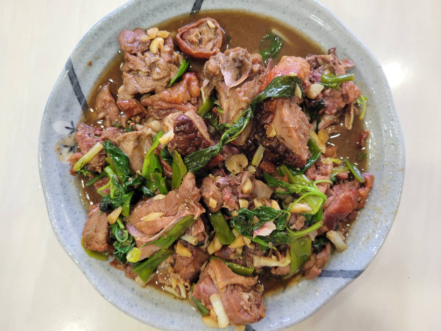 炒鴨鍋氣尚可,鹹香重,蒜末、蔥段及九層塔給得大方。