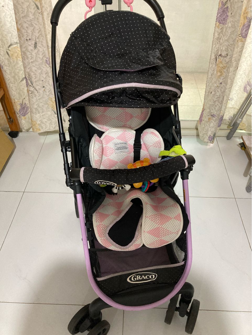 物品狀況:恩典牌,已清洗乾淨,車輪都正常,有使用痕跡,附贈涼墊和小玩具(如圖)