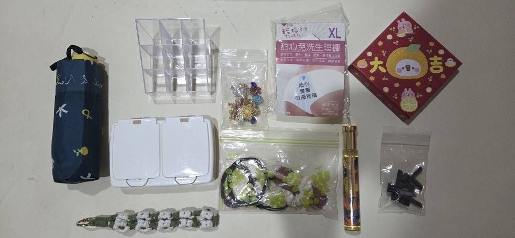 手機腕繩、摺疊傘、收納小盒、口紅架、夾式耳環、髮飾、免洗褲XL 2件、全新未過期香