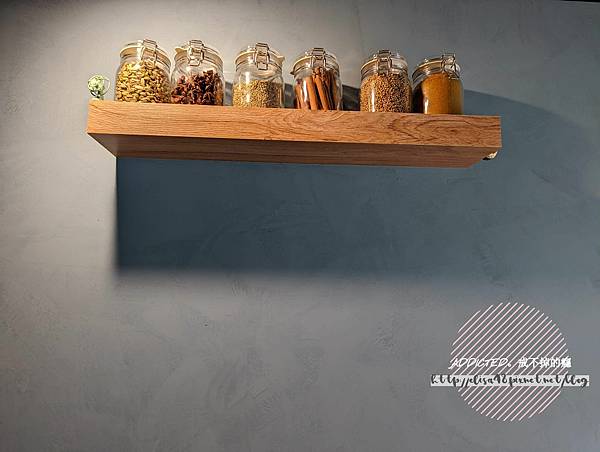 灰藍調的牆面上有著幾個木架裝飾