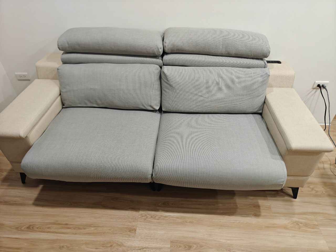 右邊那有USB孔*2、插座*2方便充電、扶手可以翻起來收納,下面可過掃地機器人,2個可