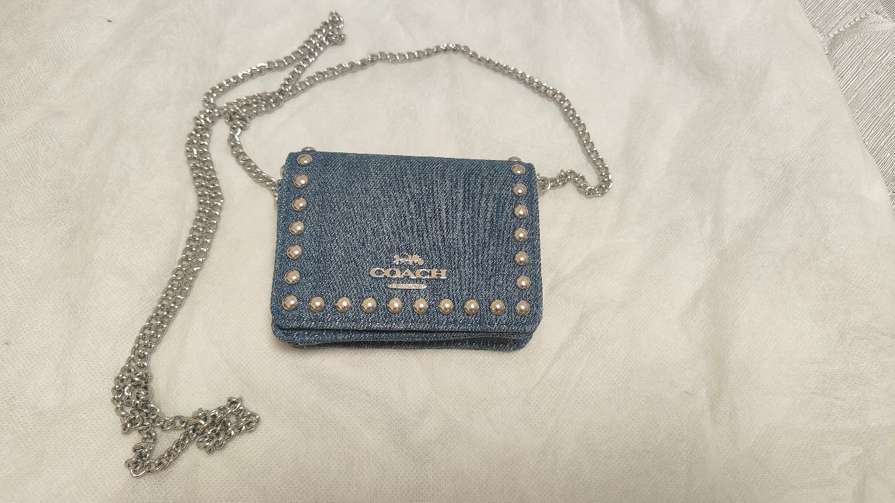 4.近全新,COACH 牛仔布鉚釘鏈帶斜背迷你包 (可拆卸鏈帶的小廢包),尺寸:寬10CM高8